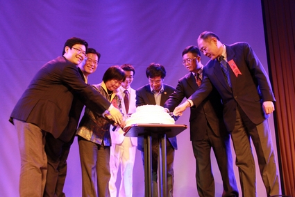 出席晚会的诸位领导一起共同切下生日蛋糕,并向本月过生日的三位师生代表赠送了生日礼物,全场在合唱“祝你生日快乐”的音乐声中,共同庆祝det365官方网站登录102岁华诞和det365官方网站登录周年纪念,祝福“五道口”明天会更好。