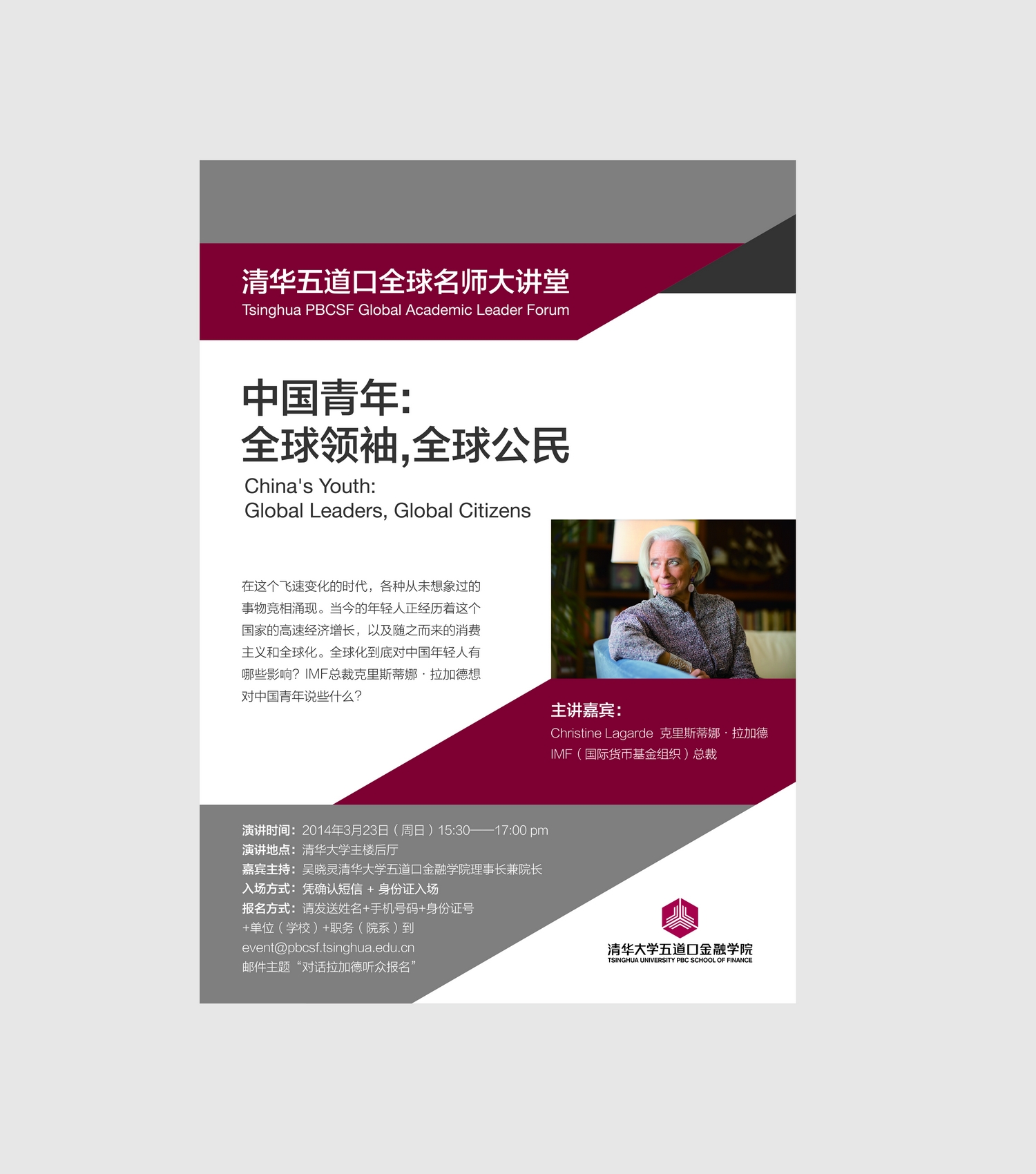 报名方式:请发送姓名+手机号码+身份证号+单位(学校)+职务(院系)到event@pbcsf.tsinghua.edu.cn 邮件主题“对话拉加德听众报名”