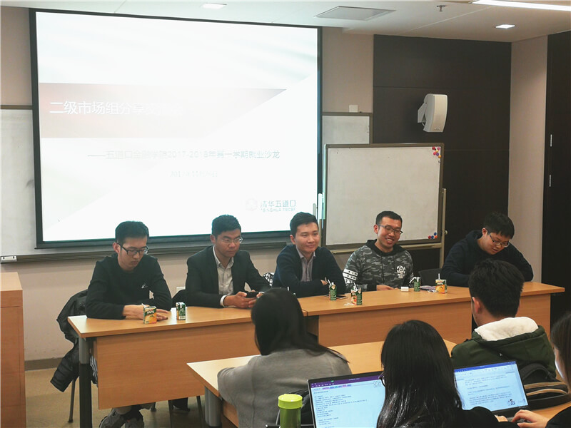 2017年11月26日,学院二级市场就业沙龙在1-301教室顺利举行。本次沙龙邀请到了二级市场横跨买方卖方、股票固收的多位道口校友。他们分别是,就职于中国国际金融公司固定收益部的2013级博士朱韦康,就职于华夏基金固定收益部的2015级硕士卞方兴,就职于新华资产管理公司的2015级硕士赵博睿,就职于华商基金研究发展部的2015级硕士崔志鹏,就职于华商基金股票研究部的2015级硕士杨志栋。五位嘉宾建议同学们在研究生阶段打好基础,培养过硬的专业素养,提升自己的核心竞争力。
