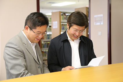 图为聂风华陪同高云龙参观图书馆