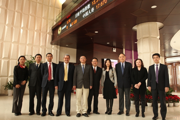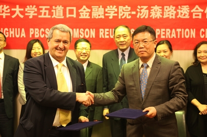 仪式前,汤森路透的嘉宾参观了学院教室和图书馆,并进行了轻松愉快的交流以及拍照留念。仪式后,双方进行了座谈,廖理介绍了学院的基本情況和未来的发展规划。马西姆简单介绍了汤森路透的发展状况,同时表示对清华五道口建院一年来所取得的成绩印象深刻。最后,双方就数据共享、学生实习、宣传推广等方面的合作进行了探讨,一致希望在未来可以开展更为广阔、深入的合作。